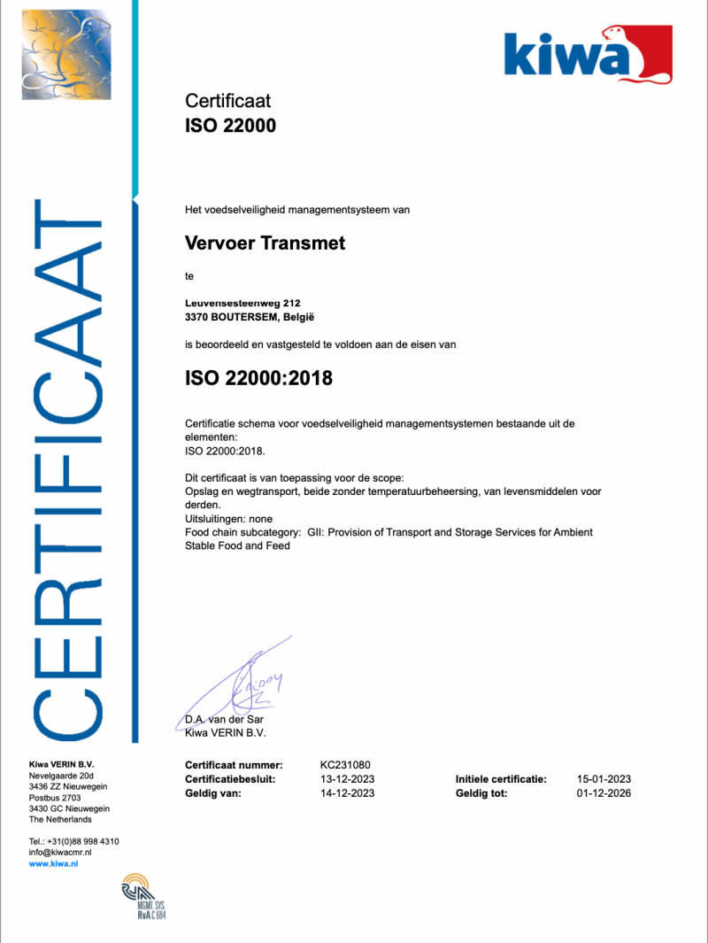 Op 25/10 heeft Transportfirma Transmet de ISO 22000 doorstaan welke werd uitgevoerd door KIWA.